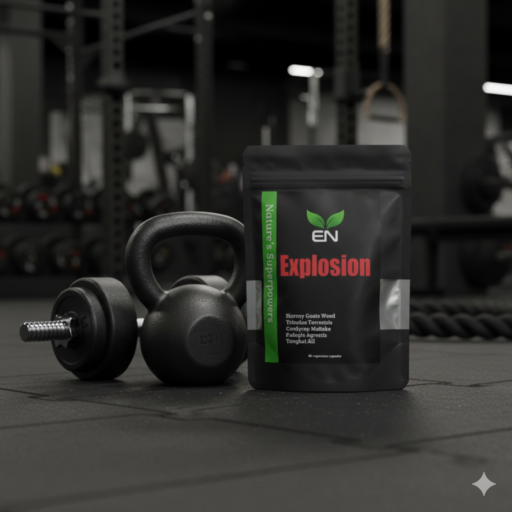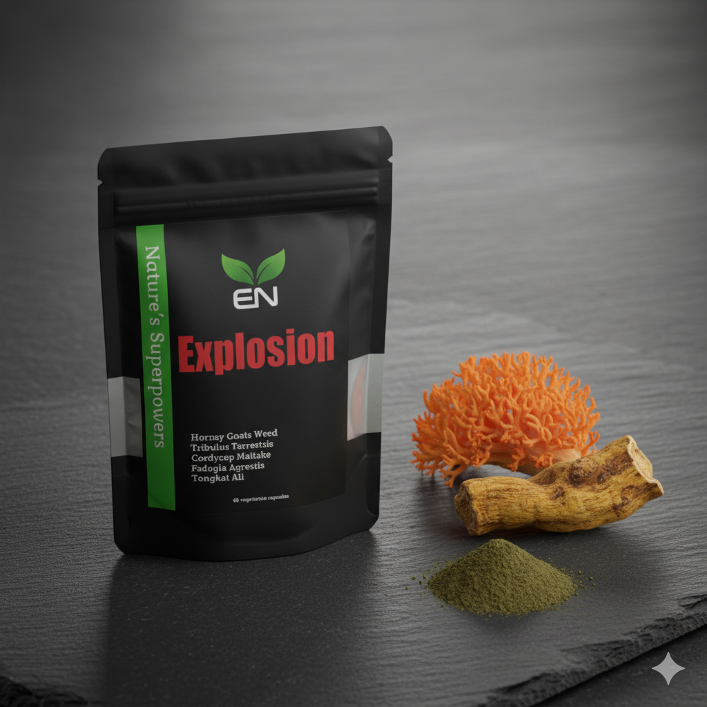 Organic Horney Goats Weed, Organic Tribulus Terrestris, Organic Tongat Ali, Organic Cordycep Maitake and Fadogia Agrestis.