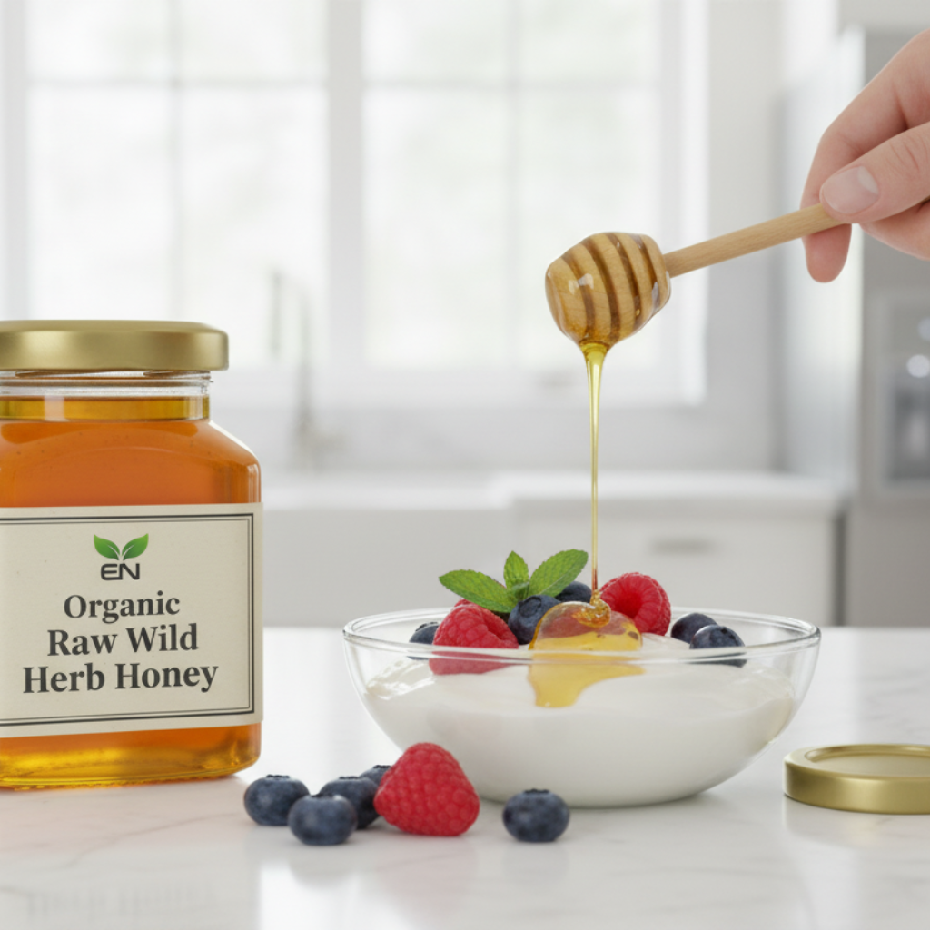 Organically raw herb honey surprisingly pleasant taste.
